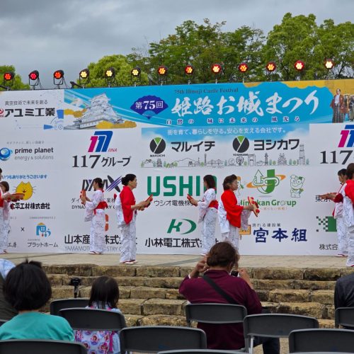 Ce matin, départ de Nara sous la pluie. Quentin enfile son plus beau poncho, c’est parti pour 30 minutes de marche sous une pluie torrentielle. Premier stop : la ville de Himeji connue pour son château éponyme. Nous arrivons complètement par hasard lors du 75eme festival du château de Himeji. Il y a des défilés traditionnels avec fanfare, mais aussi des spectacles. On décide de profiter un peu de l’ambiance avant de visiter le château, et nous avons la chance d’assister à la représentation de danse du club de country. On ne savait pas que les japonais septuagénaires étaient fans de country, mais on en prend plein les yeux. Le manque de dynamisme se fait un peu sentir et est d’autant plus renforcé par un choix musical plus que curieux : un remix électro de call me.