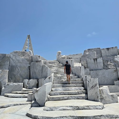 Comme conseillé la veille, nous arrivons chez le loueur à 7h du matin pour nous assurer un vélo, mais la queue est déjà longue de quelques mètres ! Heureusement, il en reste au moins deux pour nous et nous démarrons notre escapade dès 7h45. Au bout de 28 minutes, Juliette déraille. Pour ceux qui connaissent la famille Cattin, rien de bien surprenant nous direz vous. Quentin met les doigts dans le cambouis et lui répare le tout en un temps record. On repart de plus belle, traversant ponts et petits villages. Puis nous nous arrêtons pour visiter un impressionnant temple bouddhiste ainsi qu’un jardin de marbre. On passe un excellent moment, d’autant plus que ces visites sont plus qu’inattendues au fin fond du Japon. On sent que l’on est sur la fin du voyage, car Quentin perd maintenant le porte clé sur lequel est inscrit le code de l’antivol de son vélo. On est donc devant le temple, le vélo attaché, et évidemment, aucun de nous deux ne connait le code. Difficile de se sentir plus bêtes que dans cette situation. Une seule solution : retrouver le porte clé. On retourne donc au temple et miracle ! Quelqu’un l’avait déposé à l’accueil. Merci le Japon ! On finit notre première journée un peu fatigués mais très contents. Le retour se passe sans difficulté malgré la pluie qui rend notre sortie vélo un peu moins agréable. On avale les 30 kilomètres en une heure seulement, Juliette en tombe même de son vélo à l’arrivée pour le plus grand fou rire de Quentin. On rend notre matériel et on monte dans le bus pour notre avant dernière étape de notre voyage au Japon : Hiroshima.