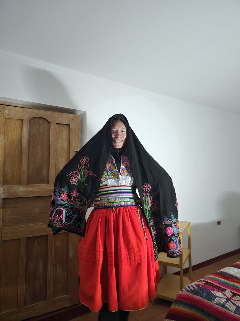 Le soir nous arrivons au moment que nous redoutions depuis le moment où le guide a évoqué le sujet dans la matinée : nous devons enfiler des costumes pour participer à notre fête d’accueil. Juliette se retrouve à enfiler la tenue complète avec un haut, une veste et une jupe tandis que Quentin a juste droit à un poncho et un bonnet.