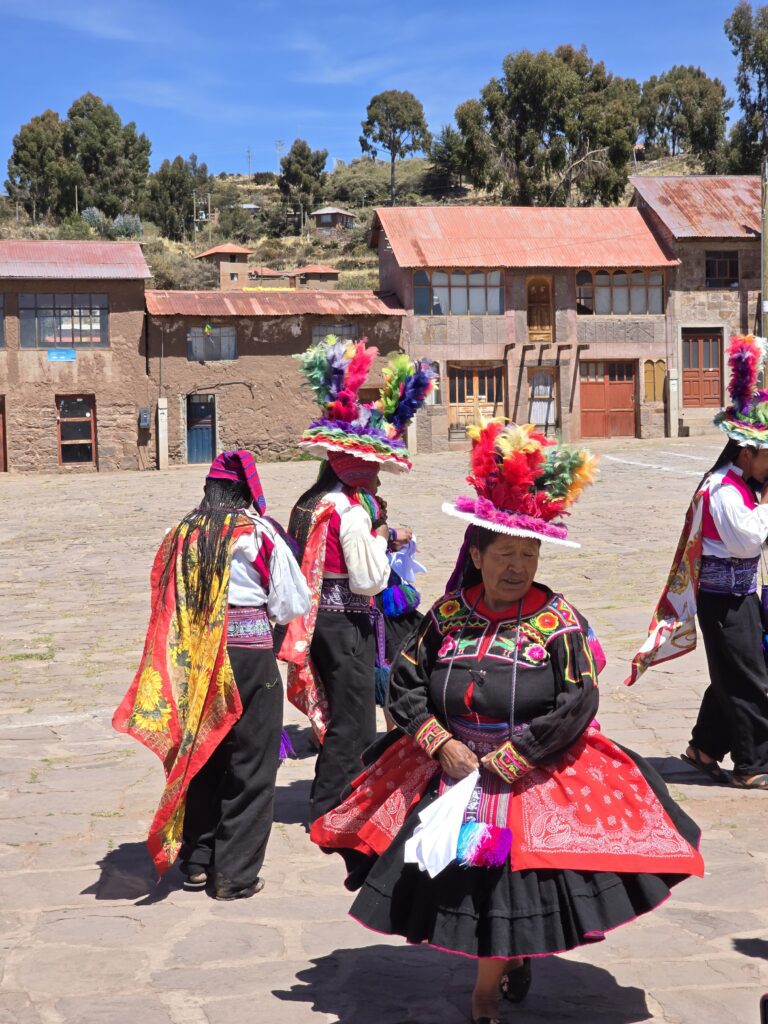 Nous visitons ensuite une île naturelle, sur laquelle vivent 5 000 habitants répartis en plusieurs communautés reconnaissables à la couleur des jupes des femmes. À l’arrivée du bateau, nous sommes accueillis par Lydia, qui sera notre hôte pour une nuit en compagnie de deux Anglaises et une Américaine. Nous profitons d’un repas à forte charge glycémique (pommes de terre et riz) avant d’aller faire une petite balade sur l’île. Le lac Titicaca étant l’un des endroits les plus sacrés pour les Incas, on peut en effet découvrir deux ruines en haut de deux petites collines : le temple de la Pacha Mama et celui du Pacha Tata (Terre-Mère et Terre-Père).