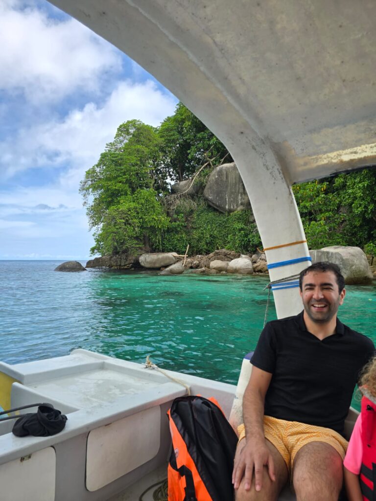 Contre toute attente (et après quelques sueurs froides), nous arrivons à temps pour le tout dernier ferry. Dans la précipitation, Juliette tente de s’évader avec un malaisien, et QQ entre dans une panique manifeste. Enfin tous réunis, nous partons. La mer s’ouvre devant nous, et au bout de la traversée… les îles Perhentian.
