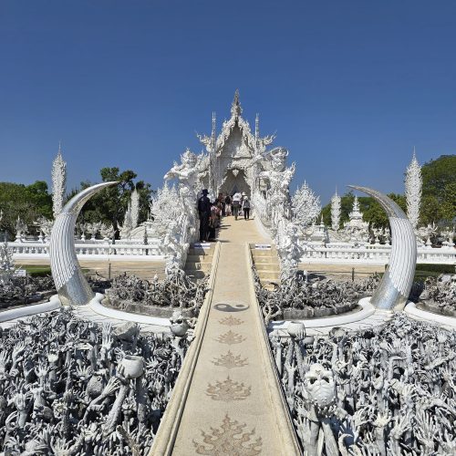 Lors de notre seconde journée, nous partons visiter le mythique Temple Blanc, le Wat Rong Khun. Un peu plus ancien que le Temple Bleu (1997), il fut dessiné par l’architecte Chalermchai Kositpipat. Il souhaitait créer un temple symbolisant la pureté du bouddhisme (d’où le blanc) face aux fléaux de la société actuelle (le vice, l’alcool, la terreur, etc.). On retrouve alors, à notre grand étonnement, des personnages de Predator dans la cour, aux côtés de terrifiantes mains sortant du sol. À l’intérieur, contrairement à l’habitude, ce ne sont pas des fresques sur la vie de l’Illuminé que nous découvrons, mais plutôt une sorte de bande dessinée inspirée de la pop culture. On retrouve Batman, Elvis Presley, Kung Fu Panda, Keanu Reeves ou encore Pikachu. Délirant, mais pour le moins original.