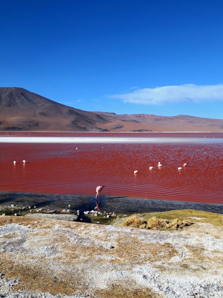Pour notre deuxième journée, le programme est chargé et pas mal de route nous attend dans des paysages plus incroyables les uns que les autres. Nous traversons le Salar de Chiguana avec vue sur le volcan Ollague qui fume en permanence. En continuant vers le sud, nous atteignons des lagunes dans lesquelles vivent des flamants roses. Le décor est toujours blanc, mais cette fois-ci cela est dû au borax présent dans l’eau et les sols et non plus au sel. Nous déjeunons dans un cadre incroyable : au bord d’une lagune au milieu des flamants roses. Puis nous arrivons au clou du spectacle : la Laguna Colorada. C’est un lac d’altitude qui prend des teintes rouges grâce à la présence d’une algue (celle qui donne aussi leur couleur aux flamants roses). Sur la lagune flottent comme des icebergs, qui sont en réalité du borax accumulé sur plus d’un mètre. Nous pensions avoir vu le plus impressionnant la veille avec le Salar, mais le Sud Lípez est tout aussi magnifique avec des paysages à couper le souffle.