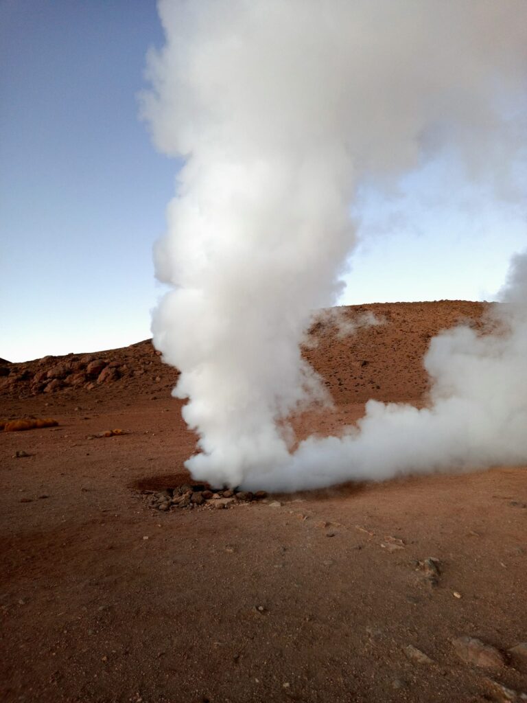 Réveil à 4h30 pour cette troisième et dernière journée afin de pouvoir voir des geysers au soleil levant. « Geysers », qui sont en réalité de simples fumerolles au son de cocotte-minute et à l’odeur d’œuf. On y voit des cuves de boue bouillonnante qui explosent à grosses bulles, spectacle impressionnant de bon matin. Il est possible de faire un plongeon dans des sources d’eau chaudes voisines, mais l’idée de se mettre en maillot de bain par -10°C nous refroidit (dans tous les sens du terme) et nous optons plutôt pour un café en attendant les peu nombreux courageux. Nous poursuivons notre route jusqu’au désert de Salvador Dali. Zone nommée ainsi puisque le paysage ressemble étrangement aux tableaux du peintre, alors même qu’il n’y a jamais mis les pieds. Nous finissons notre route au pied du volcan Licancabur où nous passons la frontière chilienne. C’est pour une fois assez long et compliqué, il faut remplir des documents en ligne, avec une connexion internet quasi inexistante et un téléphone encore plus lent qu’un Colombien au travail. Armés de patience (surtout Quentin, car celle de Juliette, tout comme la connexion internet locale, est quasi inexistante), nous finissons tant bien que mal à nous faire accepter et nous reprenons la route pour seulement quelques minutes afin d’atteindre notre première étape chilienne : San Pedro de Atacama.